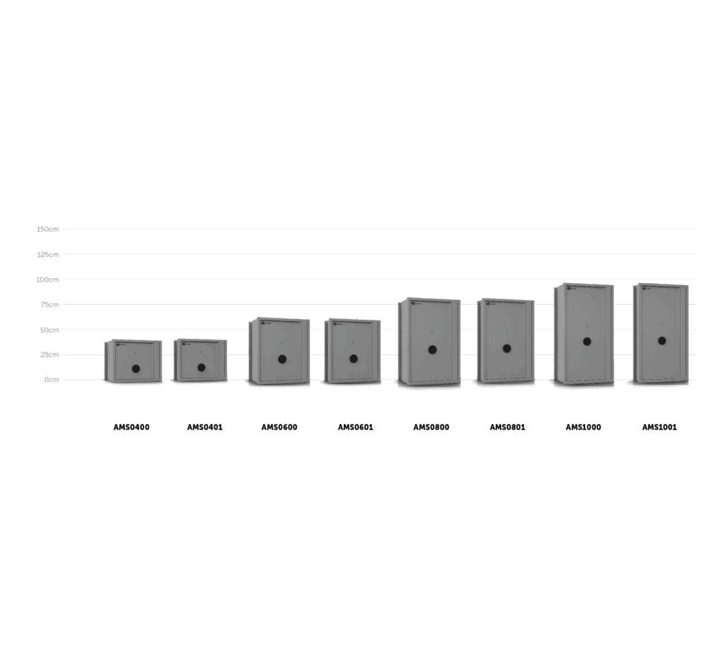 Um den Anforderungen moderner Bauweisen gerecht zu werden, besitzen Wandtresore oft nur eine geringe Tiefe. Die Modelle AMS0401, AMS0601, AMS0801 und AMS1001 bieten zwar keine Ordnertiefe, ermöglichen jedoch die Aufbewahrung eines Aktenordners parallel zur Tür.