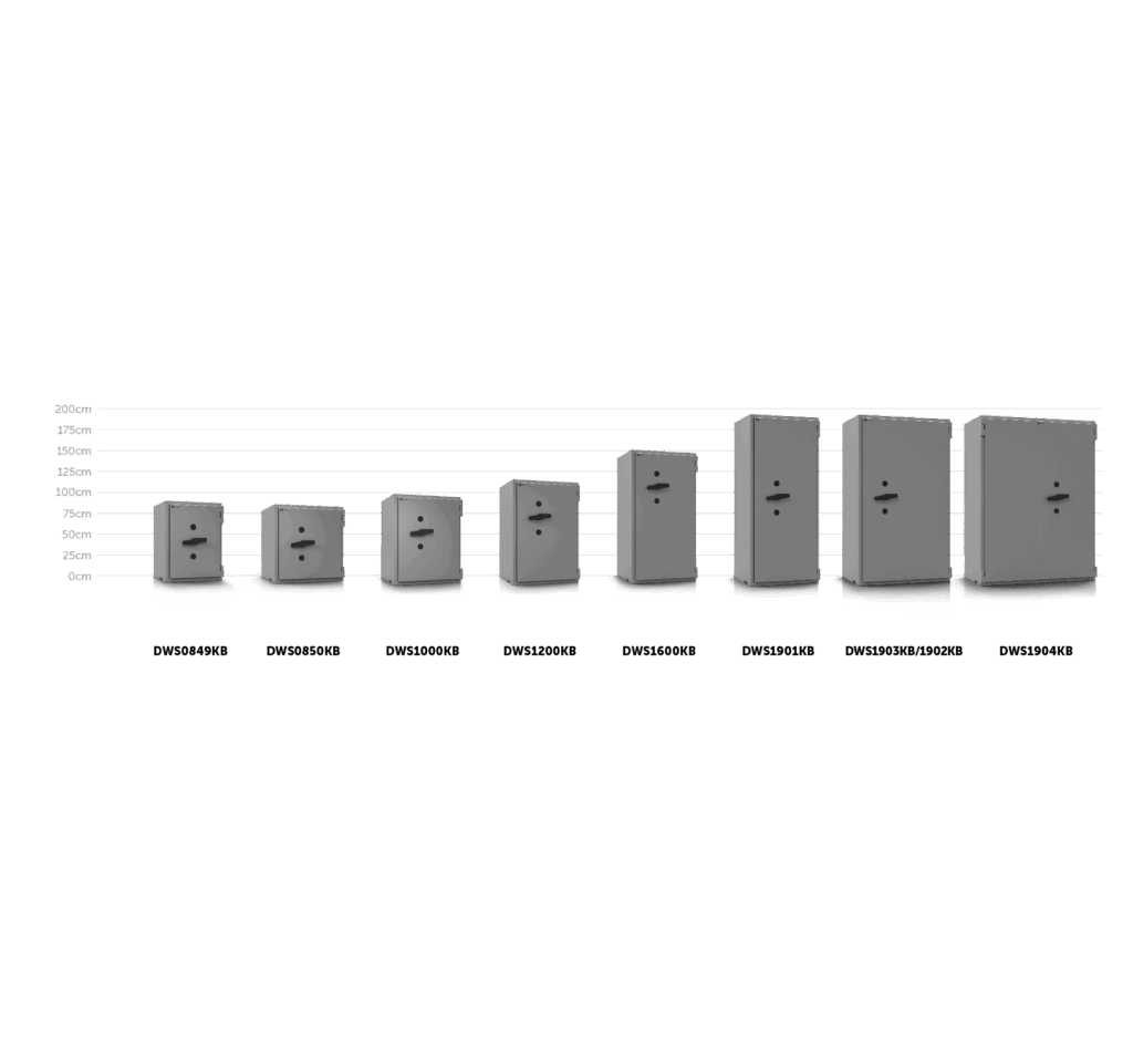Die hochwertigen Tresore der DWSKB-Serie von Wertheim zählen zu der Königsklasse unter den Wertschutzschränken. Durch ihren speziellen Wandaufbau bieten alle Modelle mit dem Zusatz „KB“ noch einen zusätzlichen Einbruchschutz gegen Angriffe mit Diamantkronenbohrer. Das ermöglicht eine noch höhere Einstufung bei den möglichen Versicherungssummen. Alle Modelle der DWSKB-Serie überzeugen durch ihr großzügiges Innenraumvolumen, ihre robuste Konstruktion und ihr elegantes Design. Die Modelle DWS1902KB und DWS1904KB sind zweiflügelig und bieten das größte Innenraumvolumen unter den Wertheim-Tresoren. Damit sind diese Tresore ideal für den Einsatz in Banken, Juweliergeschäften, Wettbüros und überall dort, wo hohe sechsstellige Werte sicher aufbewahrt werden müssen.
