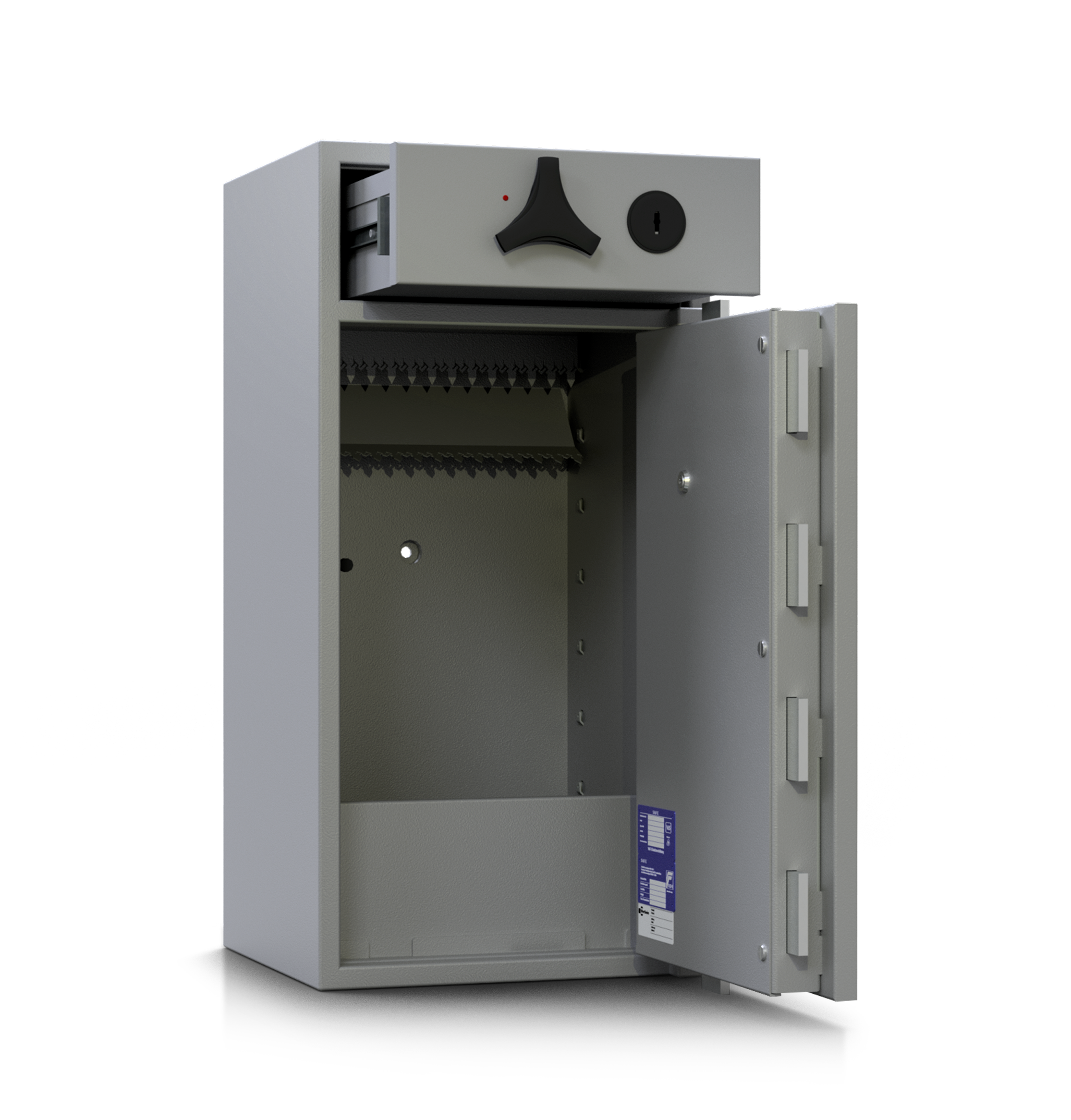 Deposittresore mit zertifizierter Einwurflade bieten eine einfache und sichere Verwahrung von Tageslosungen, insbesondere für Tankstellen, Gastronomiebetriebe und Handelsketten. Sie schützen effektiv vor Überfällen, indem das Einwurfgut sicher deponiert wird. Die Einwurflade ist auf Widerstandsfähigkeit gegen Gewaltanwendung und das Herausfischen des Einwurfguts geprüft.