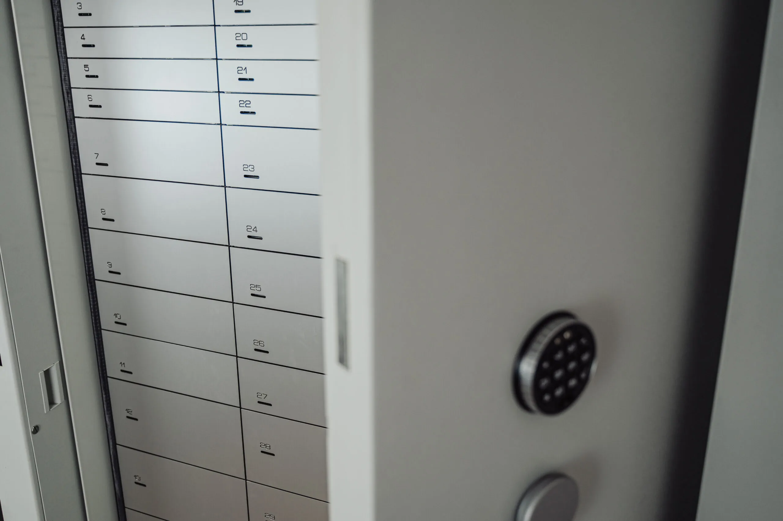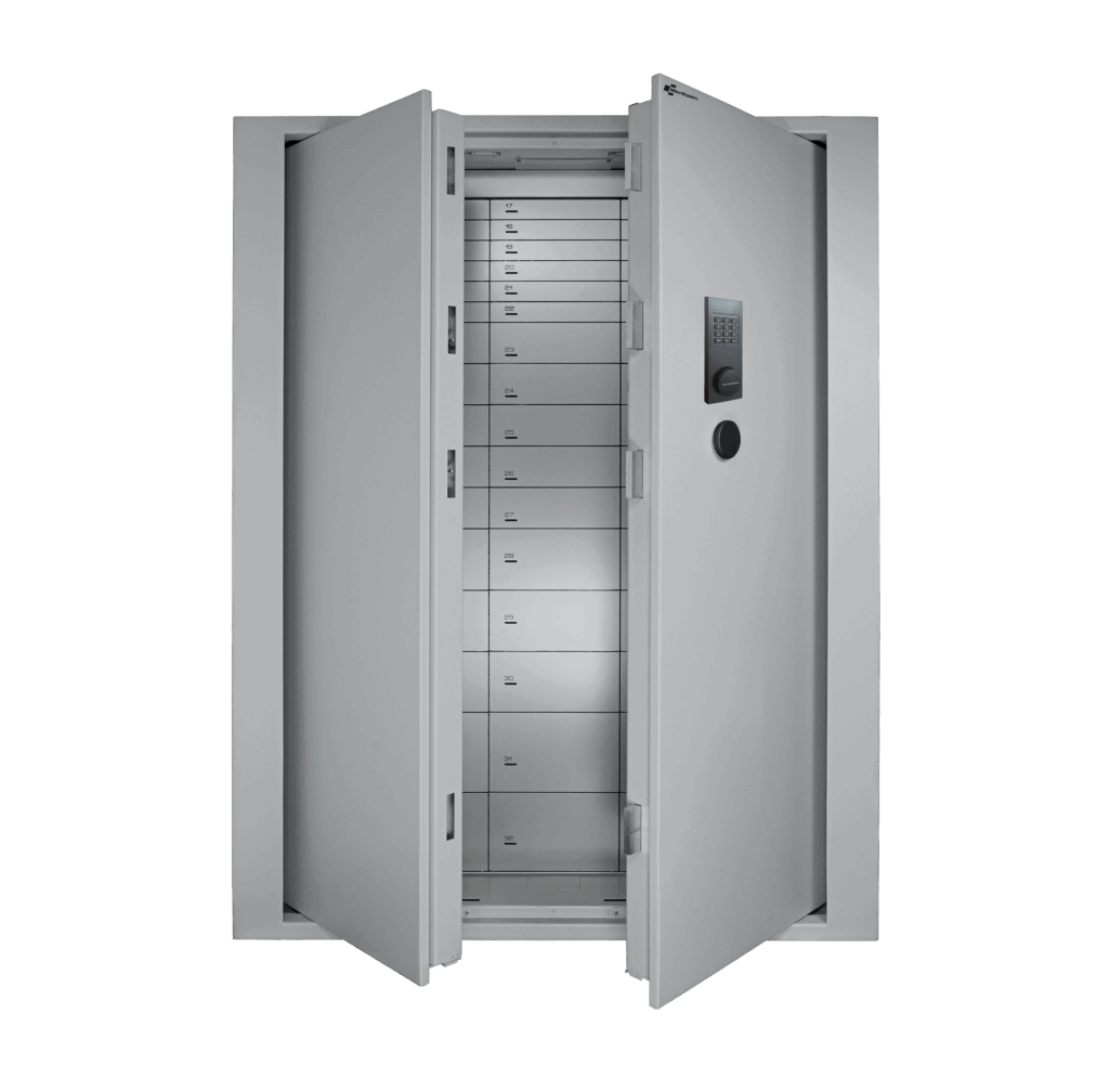 Die Tresore der BWP-Serie von Wertheim bieten hervorragende Sicherheit und verfügen über Einschwenktüren, die beim Öffnen seitlich in den Tresorkörper einschwenken. Diese Konstruktion sorgt dafür, dass der Bereich vor dem Tresor uneingeschränkt zugänglich bleibt. Mehrere Tresore können problemlos nebeneinander platziert werden. Diese Serie ist ideal für Einrichtungen mit integrierten Schließfächern, oder andere Anwendungen, in denen die Türen tagsüber offen bleiben, ohne im Weg zu sein.