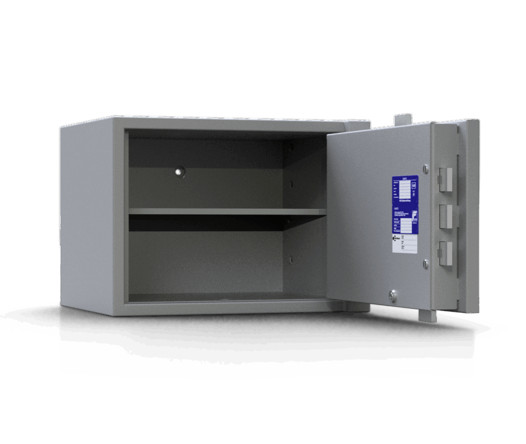Standardmäßig werden die BM-Tresore mit einem Doppelbartschloss mit zwei Schlüsseln geliefert. Optional können Sie Ihren Tresor mit einem Elektronikschloss oder weiteren Schlossmodellen ausstatten. Ab BM15 ist der Einbau eines Elektronikschlosses mit mechanischem Notschloss (Combi B90) möglich.